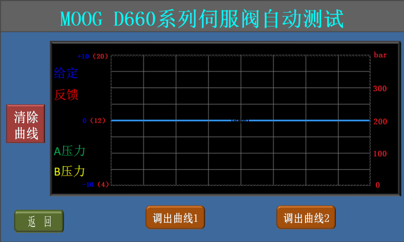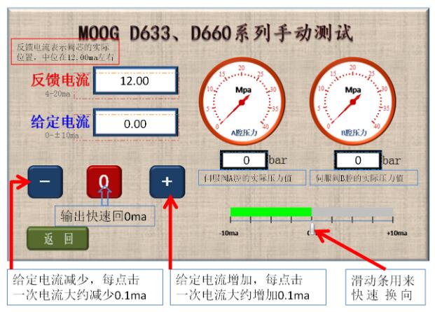 6、伺服閥正常時(shí)的表現(xiàn)為:a、給定電流0ma時(shí),反饋電流在12.00ma,伺服閥輸出的A、B腔壓力相同;b、用滑動(dòng)條可迅速換向,反饋電流改變且A、B腔壓力差較大;c、點(diǎn)擊增加按鈕,反饋電流逐漸增加且A、B腔壓力差逐漸增大;d、點(diǎn)擊減少按鈕,反饋電流逐漸減少且A、B腔壓力差逐漸減少,過(guò)0ma后伺服閥會(huì)換向;